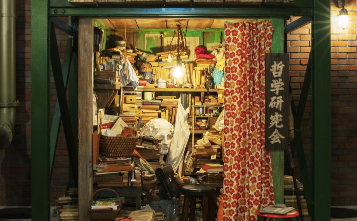 『コクリコ坂から』に登場する「カルチェラタン」の一角にある哲学研究会の部室。学生の熱量を感じさせるさまざまな書物や雑貨が所狭しと置かれています。